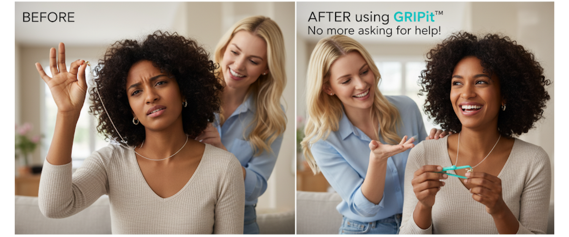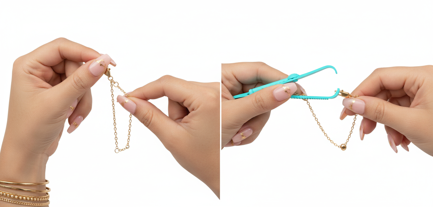 Clip GRIPit’s V-tip onto the loop beside your clasp and rest the nail tip on the clasp lever.